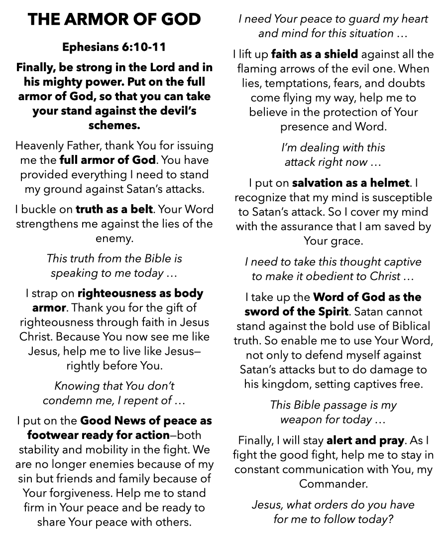 Heavenly Father, thank You for issuing me the full armor of God. You have provided everything I need to stand my ground against Satan’s attacks.